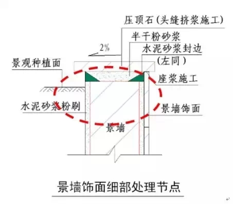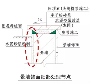 (1)景墻內(nèi)側(cè)未做防水,雨水從灰縫中流到景墻正面形成泛堿流掛污染現(xiàn)象。