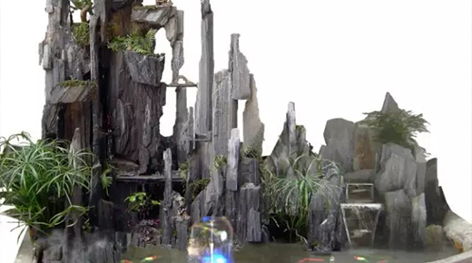 石造景,可橫層劈截或粘接組合,特別適宜于樹石盆景和駁岸、散點(diǎn)石配置,做山水盆景時(shí),橫